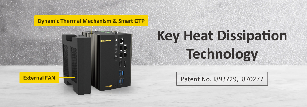 Maintenir un CPU desktop à pleine charge dans un châssis de 150 mm impose des contraintes thermiques sévères. Cincoze y répond avec deux technologies brevetées. Le Dynamic Thermal Mechanism (brevet I893729) élimine les tolérances mécaniques entre le dissipateur CPU et le capot supérieur, puis transfère la chaleur vers des ailettes en aluminium extrudé. Un ventilateur externe évacue les calories tout en empêchant l’intrusion de poussière. Le système Smart OTP (brevet I870277) surveille en temps réel l’état du ventilateur et déclenche des alertes de température avant tout emballement thermique.